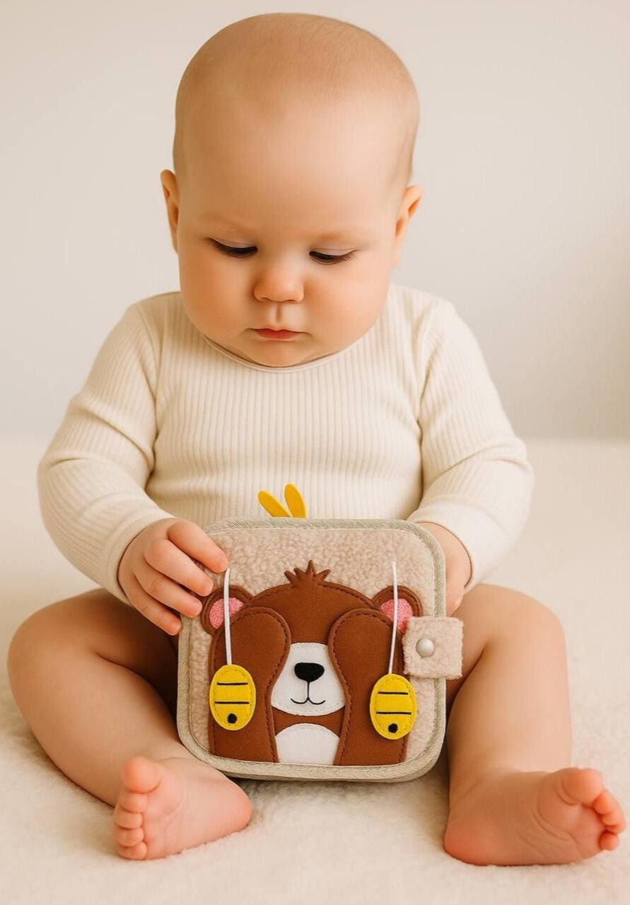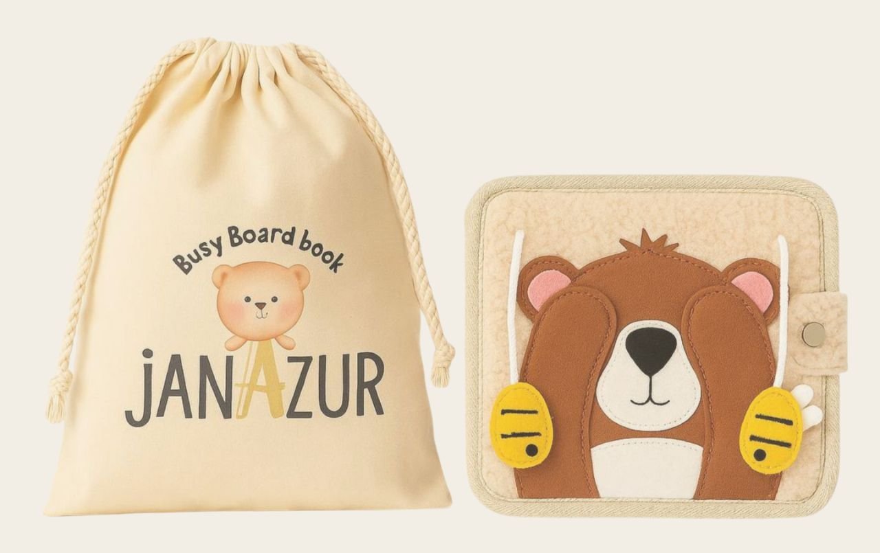 Les jeux sensoriels bébé et les jouets d’éveil 6 mois comme le livre sensoriel Janazur stimulent la curiosité et développent la coordination œil-main.